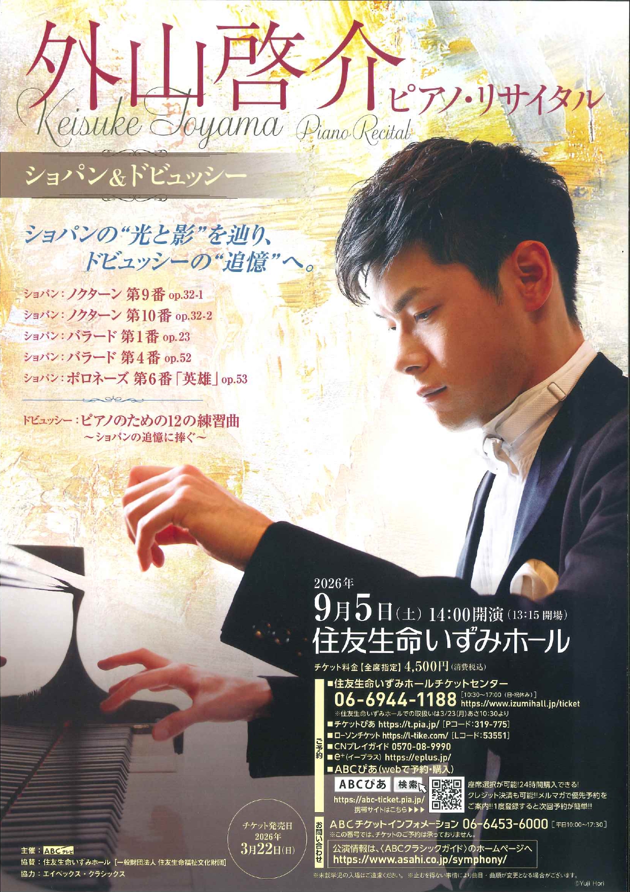 9/5(土) 14:00 | [大阪] 住友生命いずみホール | 外山啓介ピアノ・リサイタル~ショパン&ドビュッシー ショパン:ノクターン第9番 op.32-1 ショパン:ノクターン第10番 op.32-2 ショパン:バラード第1番 op.23 ショパン:バラード第4番 op.52 ショパン:ポロネーズ第6番「英雄」 op.53 ドビュッシー:ピアノのための12の練習曲 ~ショパンの追憶に捧ぐ~ | ABCチケットインフォメーション 06-6453-6000 全席指定4500円 ※発売日: 3/22(日) | |