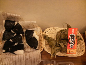 | ピアノ位置に迷う | 米どころ新潟のおにぎりと笹だんご おにぎりは12個。 外山2個 マネージャー1個 担当の江部さん1個 終演後 2個しかのこっていない 4個食べたと疑われている調律の平山さん |