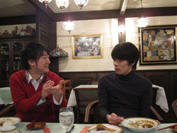 | 前日のコンサートに出演した佐野主聞君と。 | ある話題から豹変する佐野君。 5月16日に、同じ音楽堂でコンサートがあるそうです。 |